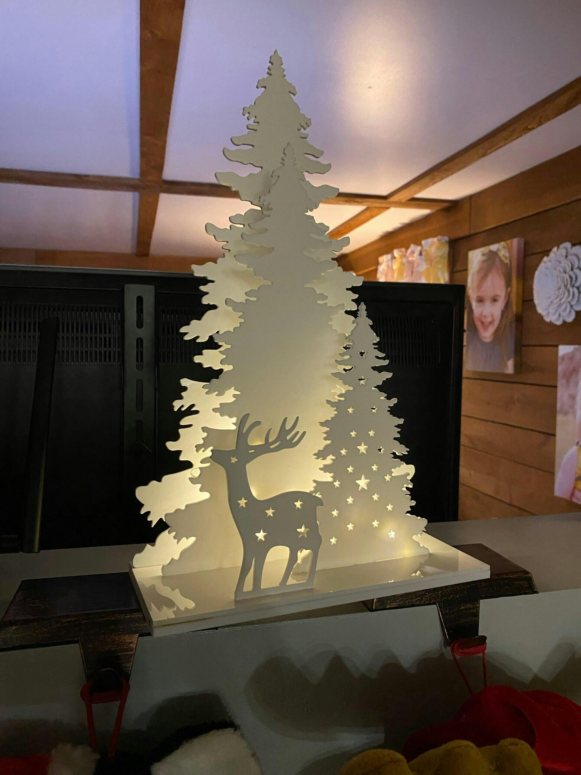 This enchanting woodland scene, featuring a graceful deer among the trees, makes the perfect winter decoration. The tallest tree measures 15 inches (plus ½ inch for the stand), and fairy lights (included) can be threaded through the center to create a warm, three-dimensional glow. Crafted from white cast acrylic, the display easily disassembles and stores flat for convenience.